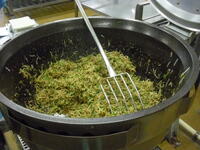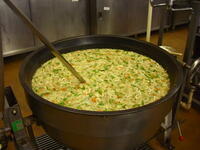 もやしのごまおかか和えは、おかかの風味が口いっぱいに広がりました。下の写真は、全校分の量です。釜で混ぜ終わったら、各クラスの食缶に入れます。