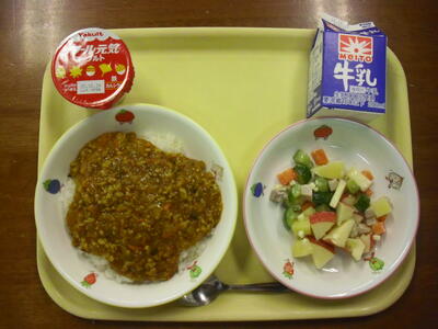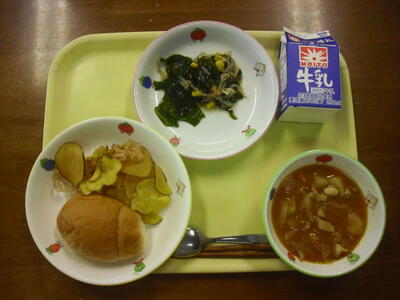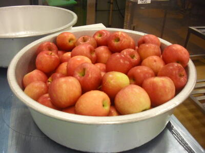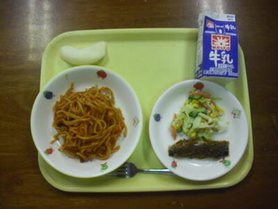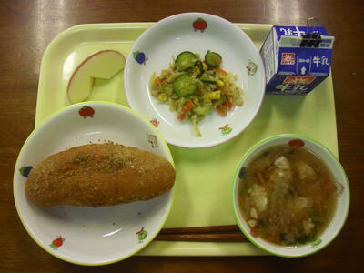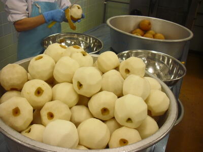 りんごは、おいしい季節になりました。噛むと口の中で果汁でいっぱいになり、まるでリンゴジュースを飲んでいるかのようなみずみずしさでした。給食室には86個のりんごが届きました。傷みが少なくきれいなりんごでした。2人で1/8カットし約680人分を作りました。