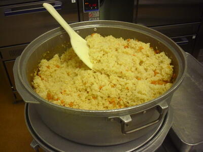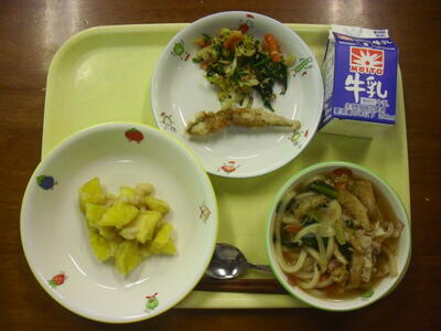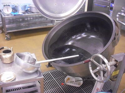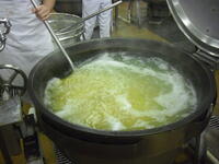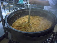 五目うどんは、野菜たっぷりで、なおかつ出汁のうまみが強く感じられる味わい深い一品でした。給食で使用したうどんは、57kgです。これを3回に分けて釜でゆでます。