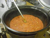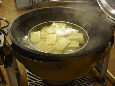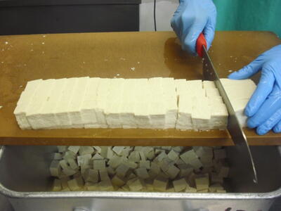 マーボーどんは、ほどよい辛みとうまみでごはんが進みました。使用した豆腐の量は、なんと37.7kg!これを手切りでサイコロ状にします。