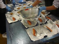 さけのチャンチャンやきは、みそだれを作り、鮭にかけてホイルで包みオーブンで焼きました。5名で、約680食を作りました。とても大変でしたが、おいしくいただきました。