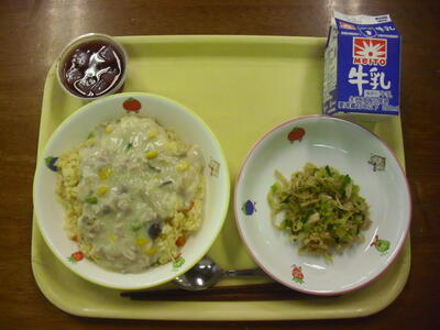 キャロットピラフに入っているにんじんは、目に良いといわれています。にんじんを小角切りにして食べやすくしました。上にかけたクラムチャウダーとの相性が良かったです。クラムチャウダーに入っているグリンピースも目に良い食材です。
