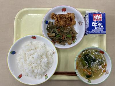 ご飯 鶏肉のから揚げ 茎わかめの金平 野菜スープ 牛乳 です。
