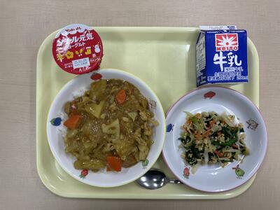 なかよしカレー(玄米ご飯) たまご入り五色和え ヨーグルト 牛乳 です。