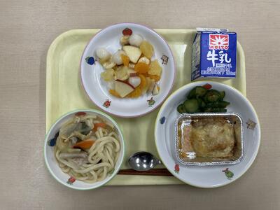 ほうとう風うどん 豆腐とツナのグラン きゅうりの土佐和え フルーツ白玉 牛乳 です。