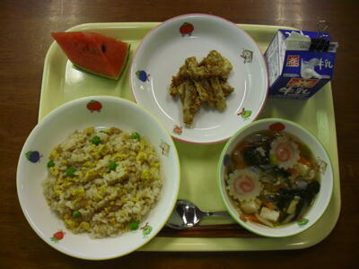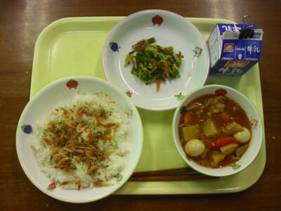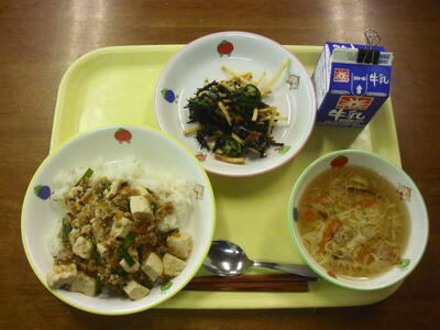 パリパリひじきサラダは、「パリパリ」の正体は千切りして素揚げしたじゃがいもですが、このじゃがいもが入るだけでみんなよく食べていました。今日のメニューの中で一番「おいしかった!」という声をたくさん聞くことができました。