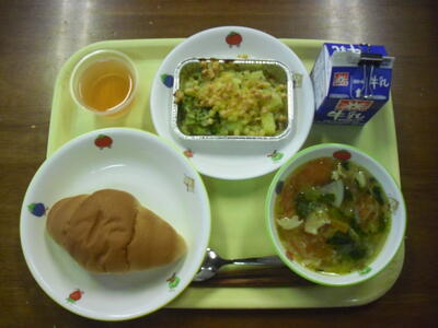こめこマカロニグラタンは、給食室で手作りしました。具沢山でとてもおいしかったです。