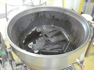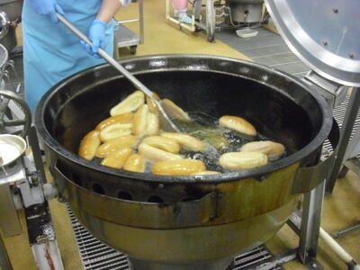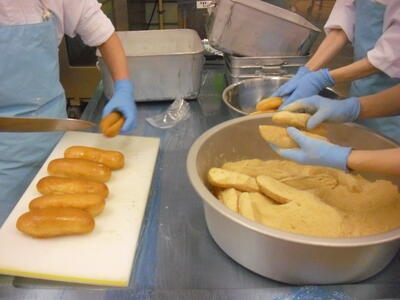 揚げる人が1名、縦に半分に切る人が1名、粉をつける人が1名、各クラスの食缶に入れる人が1名、合計4名の方で作業をしていただきました。