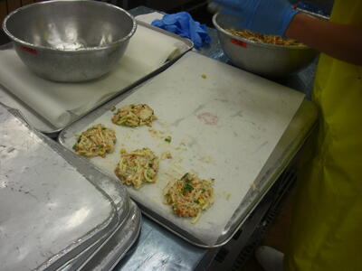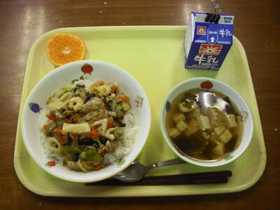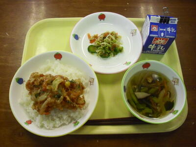 さくらえびのかきあげは、給食室で手作りしました。かき揚げのサクッとした香ばしさにタレが良く合いました。