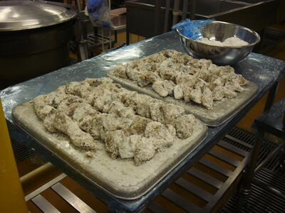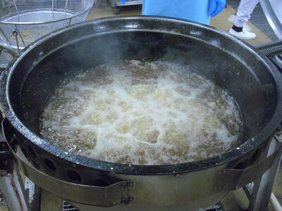 かつおのこうみあげは、薄い衣でカリッと香ばしく揚げました。国府台小学校の調理員さんは、揚げ物のプロです。揚げあがったかつおは、しょうがとにんにくを効かせたねぎダレをかけて提供しました。