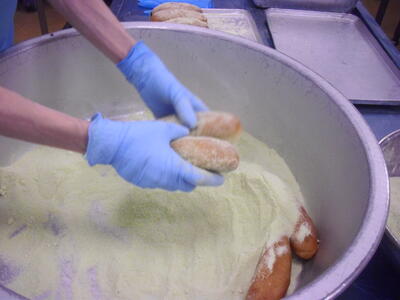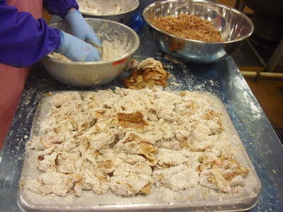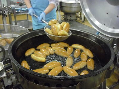 うぐいすあげパンは、揚げる方1名、粉をつける方が2名、計3名で約700個を作りました。味付けの粉は、「うぐいすきなこ」というものを使用しました。揚げ具合がちょうどよく、おいしく仕上がりました。