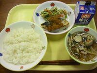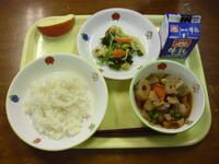 すまし汁は、わかめ、大根、たけのこ、しめじ、水菜の5種を使った汁物でした。食材にほどよく火が入り、食材の食感を生かすことができました。「おいしい!」と言いながら食べている児童がいて嬉しい気持ちになりました。