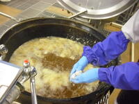 れんこんサラダは、れんこんをスライスし、チップスにするために素揚げします。サラダのドレッシングは、すりごまや練りごまなどの調味料を合わせたドレッシングでした。チップスがあると、サラダが食べやすくなるようで、残菜の少ないクラスが多かったです。