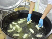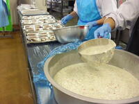 ↓ごはんを各クラスの食缶に入れる作業をしています。クラスごとの食缶に料理を分ける作業を、給食業界用語で「配缶(はいかん)」といいます。ごはんの配缶作業は2名で行います。今日のお米の重量は、玄米と合わせて48kgでした。