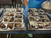 かつおのマヨネーズ焼きは、5名で約705個を手作りしました。アルミ皿にかつおをのせ、さらにマヨネーズソース、ピザ用チーズをかけてオーブンで焼きました。お魚が苦手な児童がいましたが、少しは頑張って食べている様子でした。