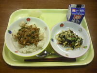 マーボーどんは、香味野菜を細かく刻んで香りよくするために、よく炒めました。大盛りをお皿に盛って食べる児童が多かったです。