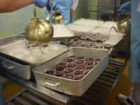 ブルーベリーゼリーは給食室で、3名で約700個を手作りしました。ナタデココが入っており食べ応えがありました。