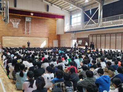 校長先生から「挨拶は、心と心を結ぶ懸け橋」であること、「いろいろな考えやいろいろな人と仲よくやっていく力」や「自分で解決していく力」を身につけ、成長していってほしいと話がありました。