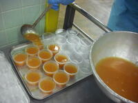 また、夕日ゼリーは、秋にきれいな夕日に見立てて、すりおろした人参、オレンジジュースを使ってゼリーにしました。