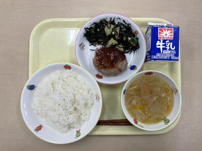 ご飯 野菜ハンバーグ チーズ入りひじきサラダ ABCスープ 牛乳 です。