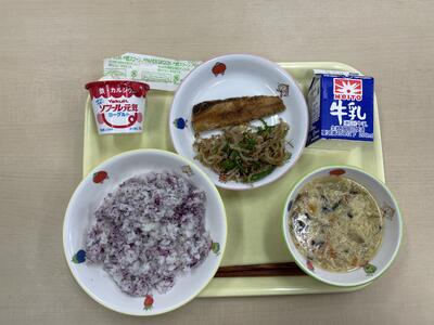 ご飯 サバの味噌煮 きんぴらサラダ 吉野汁 牛乳 です。