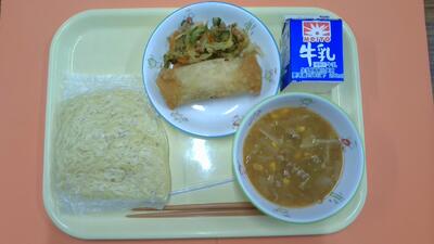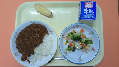 今日はカレーです。豆がゴロゴロと入って噛み応えがあります。サラダは、後乗せで細く切ったごぼうチップスが入っています。おしゃれに盛り付けられるかは給食当番さんの腕の見せ所です。リンゴもついて、全体的によく噛んで食べるメニューでした。