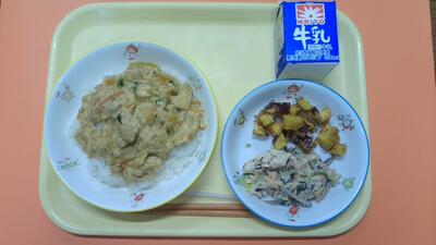 今日の献立:ごはん 親子丼の具 れんこん炒め煮 すまし汁 一口りんごゼリー 牛乳