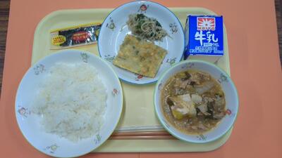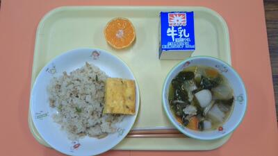 今日の献立:大豆ご飯 いわしのかば焼き のりあえ 白菜のそぼろ汁 牛乳