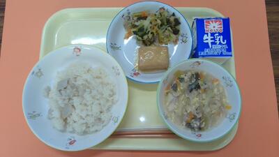 今日の献立:里芋ご飯 厚揚げの味噌田楽 豚肉と青菜の炒めもの 村雲汁 牛乳