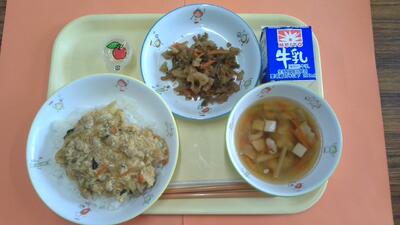 今日の献立:麦ご飯 五目あんかけ丼の具 チキンとごぼうの甘からだれ 牛乳