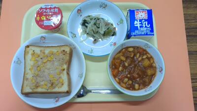 今日の献立:ツナマヨトースト チリコンカン じゃがいもと野菜のソテー ヨーグルト 牛乳
