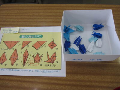 今日の5時間目の若木ゆめ学級は、県立市川特別支援学校の2名の生徒と一緒に「折り染め」を行いました。今日を含めて3回、交流として一緒に作業学習を行います。三角に折った和紙の3つの角に、それぞれ好きな色を染み込ませ広げていきます。色づかいだけでなく染料の量によっても模様の出方に個性が出て、世界に一つだけの作品が出来上がります。次回以降もどのような作品ができるか楽しみです。