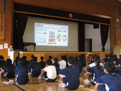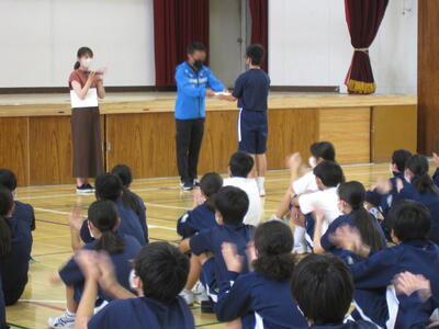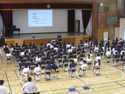 3年生が卒業して1年生と2年生だけの集会となりました。約半年ぶりに2学年そろっての体育館での集会となりましたが、みんなまじめな態度で修了式に臨んでいました。