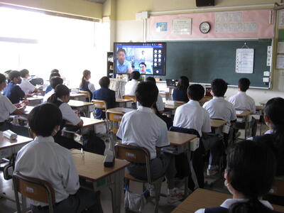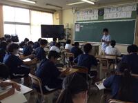 5,6時間目、「市川被爆者の会」の井上さんのお話を聞きました。長崎での被爆時の話、防空壕でのこと、ガラス片の傷が今も残っていることなど、戦争の悲惨な話だけでなく、さらに今を生きる中学生たちにと、友達の大切さや言葉の重みについてもお話いただきました。写真などの資料をたくさん使いながらエネルギッシュに講演をされる井上さんの姿にこちらも勇気をもらった思いでした。このような貴重なお話は、機会があれば他の学年にも聞かせたいと思いました。