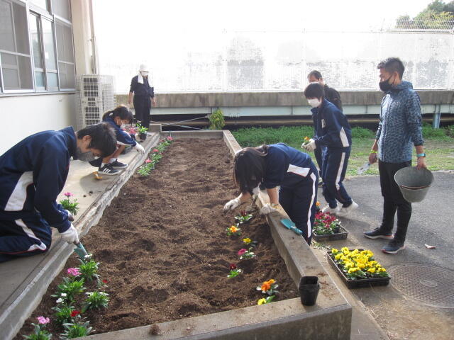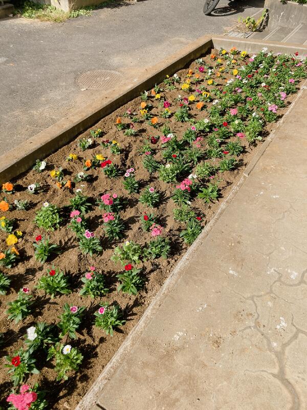 花壇に数種類の色とりどりの花を植えました。毎年の行事で、オカモト園芸さんにご指導をいただきました。