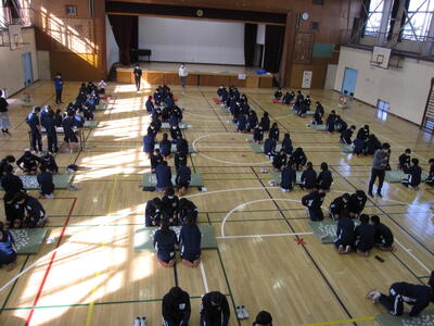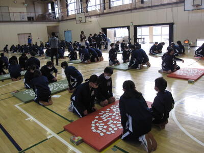 昨日、⑤⑥時間目に「百人一首大会」を行いました。体育館で各班4~5人に畳1枚を敷き、先生方が歌を詠みました。楽しみながら、真剣に札をとっていました。