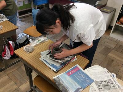 月曜日、6年生の陶芸教室が行われました。教室でおもいおもいにつくった作品を玄関まで大事そうに運んでいます。これから時間をかけて乾燥させ、うわぐすりをかけて焼成します。子供たちは、「作品ができあがるのが待ち遠しい!」と口々に言っていました。完成が楽しみですね。