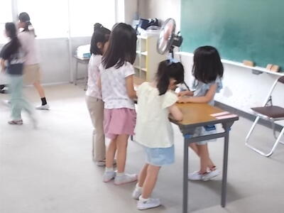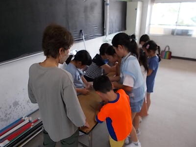 夏休み1日目。朝の学校ではラジオ体操が始まり、床工事の準備も進んでいます。また、二中の生徒さんは、灯ろうづくり。校長室の「アカテガニ」はおいしそうに鰹節を食べています。