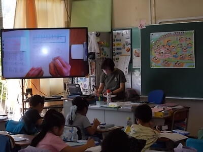 4年生の授業を途中から見ることができたのですが、子供たちは、チャールズ先生が話す英語に「いぇーい」「オッケー」「イエース」と次々に反応していて、本当に驚きました・・・