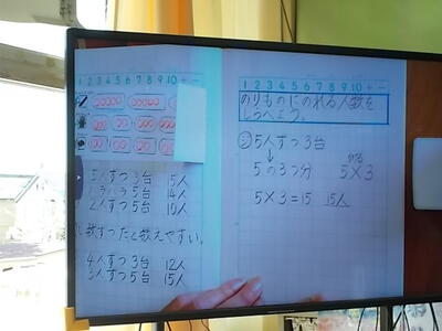 2年生は「かけざん」の学習に取り組んでいます。大型テレビに映し出されたノートを見ながら考えを整理したり、黒板の図を見て具体的に理解したり。楽しそうに、でも真剣に学習へ取り組んでいました。