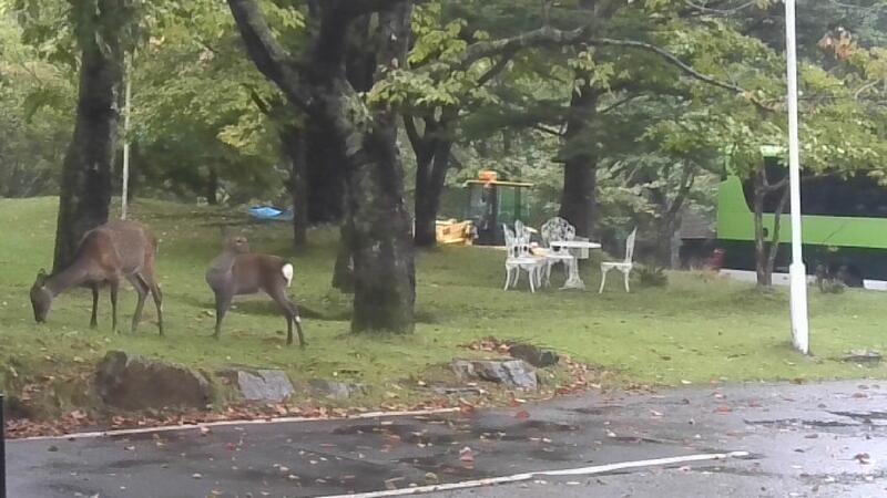 奥日光小西ホテルを出発しました。2日間たいへんお世話になりありがとうございました。鹿さんも見送りに駆けつけてくれました。小雨で華厳の滝が見れるか心配でしたが、壮大な華厳の滝を見学できました。これから日光東照宮に向かいます。