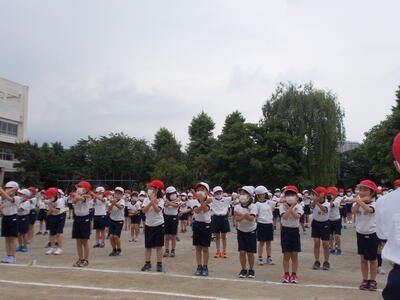 くもり空のもと運動会がスタートしました。はじめの言葉、スローガン発表、選手宣誓や競技上の注意、ラジオ体操など3年ぶりの運動会はとても新鮮で、子供たちの姿が輝いて見えました。そんな校庭に「ぽつぽつ・・・ザーッ」という無情の雨。本当に残念です。火曜日に残りのプログラムを実施します。どうぞよろしくお願いいたします。
