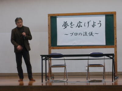 今日真間小学校に来てくださったのは、俳優座の河内 浩(かわち ひろし)さん。「夢」が「目標」になったとき、どのように努力をしていったのか、ご自身の体験をもとに話してくださいました。