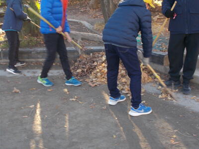 そんな低学年の脇を、高学年の子供たちは落ち葉はき。ありがとうございます。学校がどんどんきれいになります。