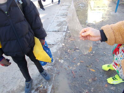 いよいよあと少しで冬休み。寒い朝は水たまりに氷が張っていて、低学年の子供たちは「こおりだ!」「すごーい」と興味しんしん。触ってみたり、割ってみたり。