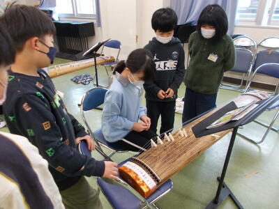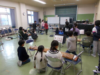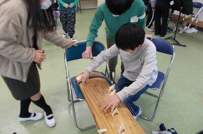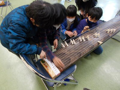 音楽室から美しい音色が聞こえてきました。箏(こと)の音色です。箏爪をはめて、いっしょうけんめい演奏している子供たち。一音ずつ奏でたり、「しゃらららーん」と全部の弦を使って演奏したり。順番を待っている子供たちも初めて触れる楽器に興味津々です。