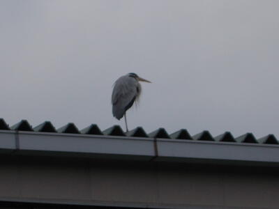 校門で子供たちが口々に「鳥がいるよ!」「白鳥かな、鶴かな?」と教えてくれました。見るとかなり大きな鳥が屋根の上で羽を休めています。寒いらしく、ずっと片足で立っています。首もなかなか出さないので写真の大部分は羽毛の塊にしか見えません。いったいなんという鳥なんでしょうか?