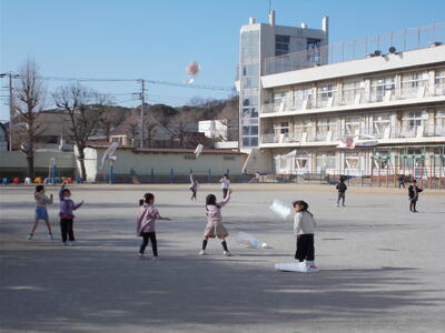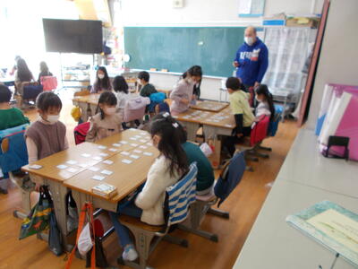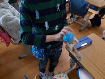 3学期、1年生はたこあげ、百人一首、すごろく、お手だま遊びを楽しんでいます。けん玉遊びの最後は、きちんとひもを巻いて・・・片付けもとても上手です。