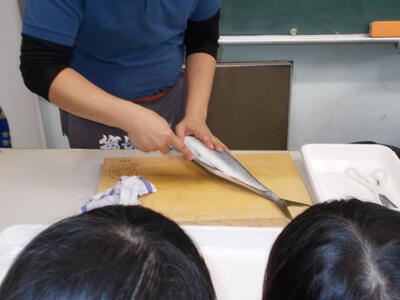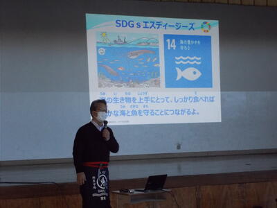 今日は大日本水産会魚食普及推進センターの山瀬さんはじめ、5名のスタッフが出前授業に来てくださいました。