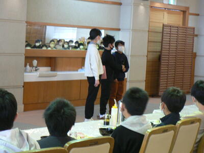 体育館の2年生、「排他的経済水域」や「SDGs」「えら呼吸」「のり養殖」「魚にウロコがある理由」「背ビレの役割」など、とてもよく知っていて、説明してくださる方も本当にうれしそうでした。